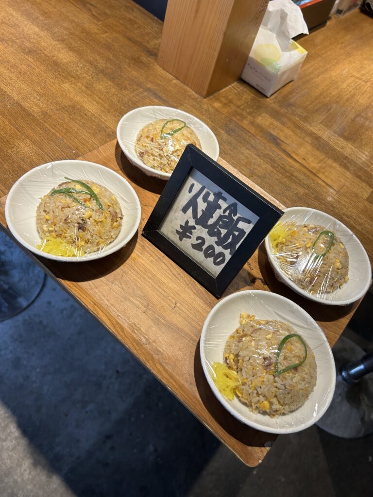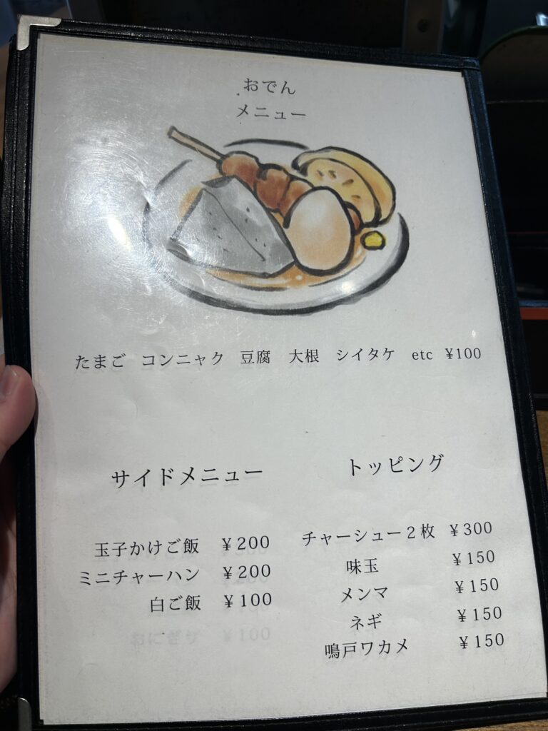 旭乃陣はサイドメニューも特徴的で、ちょうど良いサイズのチャーハン(200円)や、親鶏もものおでん(150円)など、つい一緒に頼みたくなるラインナップ。