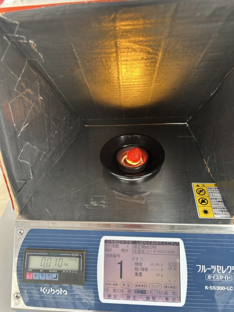 糖度を測れる機械もあり、イチゴを乗せて測定ボタンを押すだけ!
