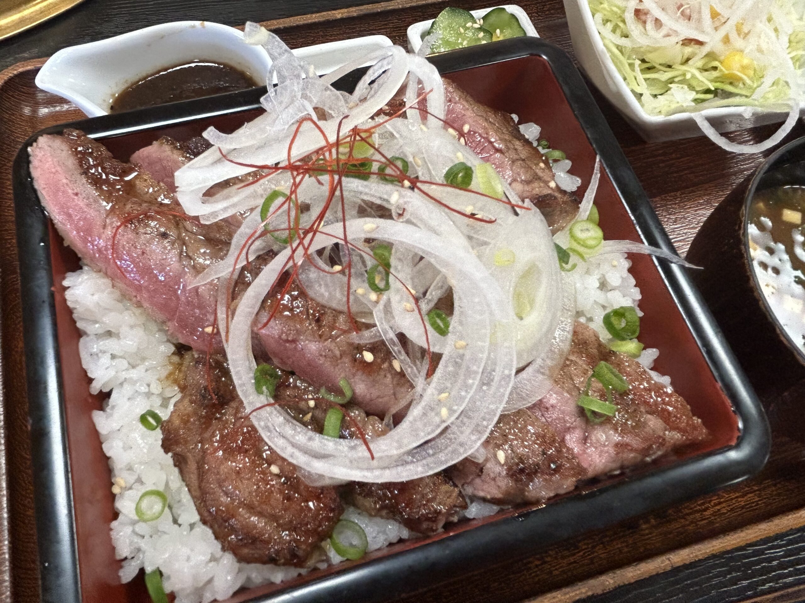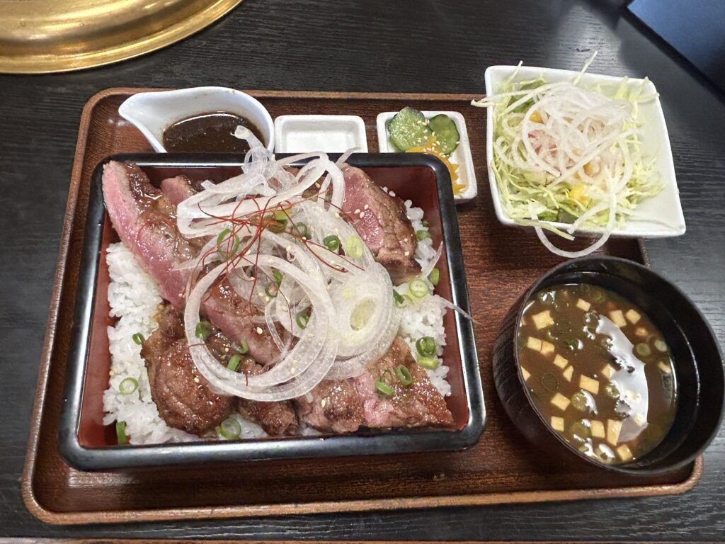 ご飯の上に厚めにカットされたステーキが並び、その上には